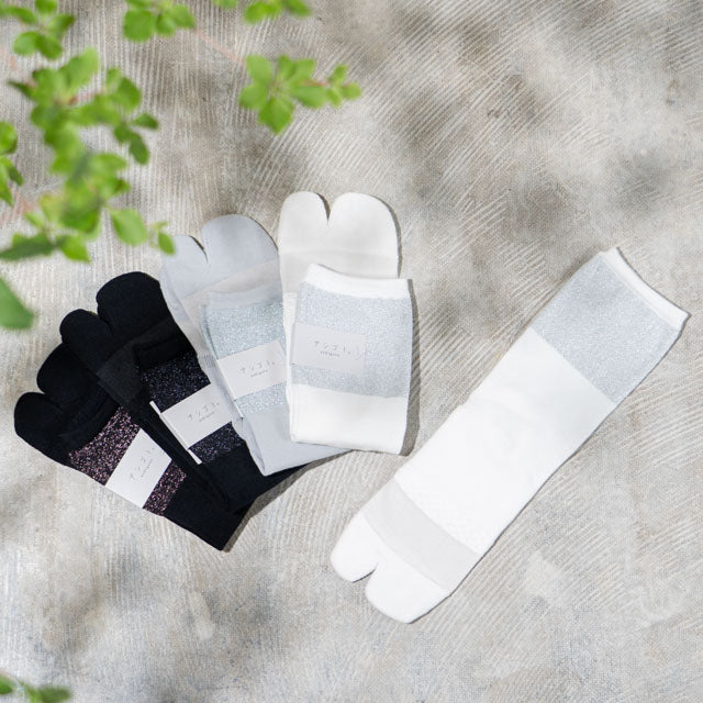 上質なラメをポイントにしたモノトーンのタビは履物を選ばないスタイリッシュさが特徴。